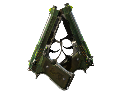 The Cobra Strike finish on the Dual Berettas features a distinctive design that sets it apart in the CS2 cosmetic ecosystem. The official in-game description reads: