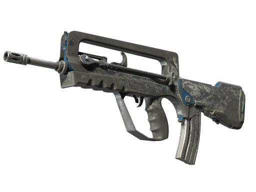 "A cheap option for cash-strapped players, the FAMAS effectively fills the niche between more expensive rifles and the less-effective SMGs. It has been custom painted with a blue and grey halftone splash pattern.\n\n<i>Even the calmest waters can quickly change</i>"