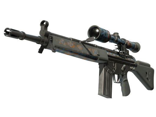 "The pricy G3SG1 lowers movement speed considerably but compensates with a higher rate of fire than other sniper rifles. It has been painted with a custom red, white, and charcoal-colored DDPAT pattern. Disruptingly intricate"