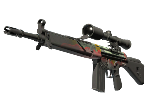 "The pricy G3SG1 lowers movement speed considerably but compensates with a higher rate of fire than other sniper rifles. It has been painted with a custom red, white, and charcoal-colored DDPAT pattern. Disruptingly intricate"